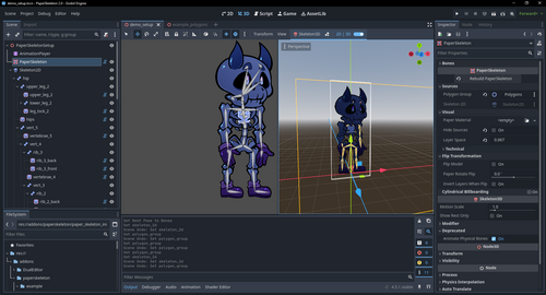 There are also features such as PaperMaterial (a much better resource-based implementation for saving and loading shader parameters), PaperSkeletonModifier3D (SkeletonModifier3D subclass designed to be a more practical replacement for PaperBone2D's modifiers), the removal of PaperBone2D (better bone tracking alternatives added in its place), various code optimizations (performance improvements), and various other smaller additions that will increase the viability of this addon for your game projects.